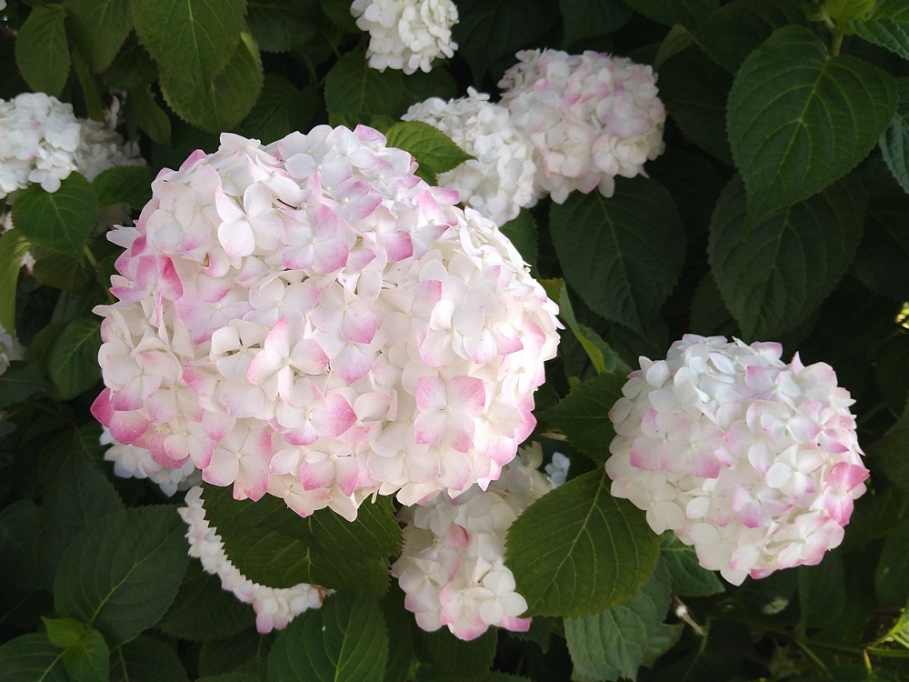 輝くように真白なあじさいに仄かな紅いろが混じる。